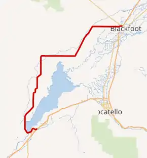 Idaho State Highway 39 begins at an interchange with Interstate 86 next to the American Falls Airport. The highway proceeds west, bypassing the community of American Falls. The road travels along the American Falls Dam, before bending northward, and traveling parallel to American Falls Reservoir. The highway continues, bending northeast, before bending back northward, and passing through the community of Aberdeen. The roadway continues north, before traveling northeast for a short distance, and turning north again. The route continues north, before bending eastward and proceeding. The highway proceeds eastward for several miles, before bending northeastward. The highway continues northeastward, and, after a long distance, passes the Rockford Municipal Airport. The road bends eastward, passing through the community of Moreland. The highway continues eastward to its eastern terminus, an intersection with U.S. Route 26.[2]