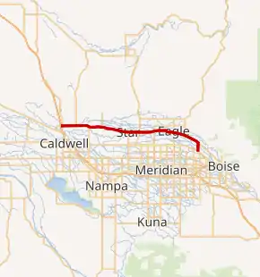 State Highway 44 starts at the junction of Interstate 84 north of Caldwell at Exit 25. The highway heads eastward staying mostly to the north of the Boise River. The highway goes through the cities of Middleton and Star. Just to the east of Star meets its junction with Emmett Highway, SH-16. Highway 44 continues east through Eagle and intersects with State Highway 55. From Eagle eastward, the highway is also known as State Street and continues toward Boise. The highway turns southward onto Glenwood Street in Garden City where it continues for approximately 1.3 miles (2.1 km) before ending at Chinden Boulevard (US-20/US-26).[2]