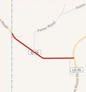 SH-66 begins at the Washington state line northwest of Viola; the route continues northwest into Washington as Palouse Cove Road. From here, the highway heads southeast through a rural area. After passing Potter Road, the route turns to the west. Shortly after passing Weber Road, SH-66 terminates at a 3-way junction with US-95 north of Viola. The route is a two-lane undivided road for its entire length.[2][1]
