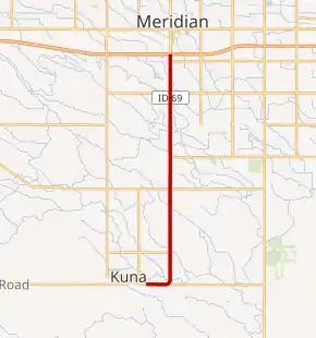 State Highway 69 starts at its southern junction and terminus in Kuna. The highway heads eastward for a short distance then turns northward on Meridian Road for several miles until it reaches its northern junction and terminus at Interstate 84, in Meridian.[1]