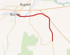 State Highway 81 begins at an intersection with SH-77 in Malta, located north of the Utah state line. The highway travels north, following the eastern foothills of the Cotterell Mountains and the Raft River valley, through Idahome to Interstate 84, which it parallels for several miles heading northwest. SH-81 completes its turn west and heads towards Declo, intersecting SH-77. The highway continues west along the southern side of the Snake River, parallel to the Eastern Idaho Railroad. It terminates at an intersection with US-30 (co-signed with Interstate 84 Business) south of Burley Municipal Airport on the banks of the Snake River, just east of downtown Burley.[1][3]
