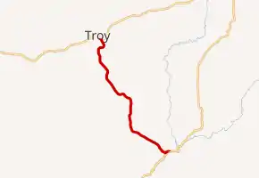 Idaho State Highway 99 begins at an intersection with Idaho State Highway 3 in the community of Kendrick. The highway proceeds northeast, exiting Kendrick, and proceeding into rural area. The highway weaves northeast and northwest for several miles, before bending northwest. The route continues through a small valley, intersecting several small roads while traveling. The roadway proceeds northward before making a large bend northwest, and entering the community of Troy. The highway continues to its northern terminus, an intersection with Idaho State Highway 8.[2]
