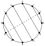 - "C-E, D-F♯, E♭-G, are different instances of the same interval [interval-4]...[an] other kind of identity...has to do with axes of symmetry [reflection symmetry rather than interval families' rotational symmetry]. C-E belongs to a family [sum-4] of symmetrically related dyads as follows:"