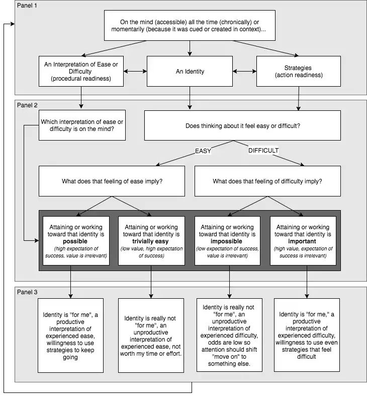 People interpret situations and experienced difficulties in ways that are consistent with whichever identities are currently on their minds, and prefer to act in ways that are identity-consistent rather than identity-inconsistent.[2][3] When actions feel identity-consistent, difficulties that come up tend to be interpreted as important, suggesting actions are meaningful. On the other hand, when actions feel identity-inconsistent, the same difficulties suggest the behavior is pointless and “not for people like me.”