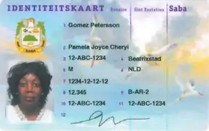 The Identity card BES (locally also known as sedula) is a uniform identity card for residents in the Caribbean Netherlands introduced upon the dissolution of the Netherlands Antilles in 2010.[1] The cards are machine-readable and have the size of a credit card. The front contains the words Identiteitskaart (English: Identity card) followed by the island names Bonaire, Sint Eustatius and Saba (with the name of the island where the card is issued in larger font and bold face). The card also contains the coat of arms of the island of issue.[2]