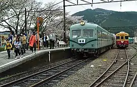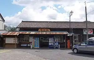 The station has a single island platform, with two headshunts on either side, connected to the station building by a level crossing. The rustic wooden station building is popular with photographers who come to shoot the steam locomotives on the line. It was also used as a location for a number of movies, including Otoko wa Tsurai yo.
