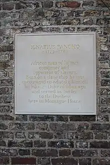 - A plaque to the memory of Sancho was unveiled on 15 June 2007, by Nick Raynsford, MP for Greenwich, on the remaining wall of Montagu House on the south-west boundary of Greenwich Park. The plaque was funded by the Friends of Greenwich Park to commemorate the bicentenary of the Abolition of the Slave Trade Act, made law in 1807. A second plaque to his memory is on the Foreign and Commonwealth Office.[29]