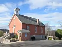 Resident Chris M. Riggs began a fundraising campaign in 1854 to construct a church in Ijamsville. Local Episcopalians donated a land lot to the cause, farmer Charles Hendry fired the bricks, and the women of the town made and sold quilts to raise the needed funds. The roof was made of Ijamsville phyllite.[13] On July 25, 1858, Ijamsville's Methodist Episcopal Church was officially dedicated and received its first two ministers—Reverends Thomas B. Sergeant and T. M. Reese—who happened to be Lutheran.[12] The church building was rebuilt in 1890 after a fire, but is one of the few original town buildings still standing today.[14] The church's basement served as the local school until 1876, when a building adjacent to the church was constructed to house the few students.[15] Professor Chasuble McGill Luckett was the school's first teacher, with other teachers (including some women form the Riggs family) riding in on horseback to help when needed. The school reportedly took $509.98 to operate each year.[3]