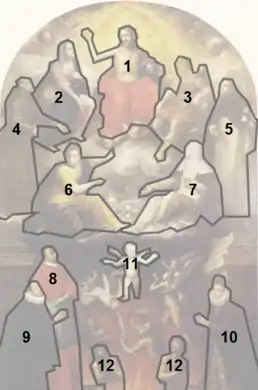 The painting presents itself as a Last Judgement scene with ten main characters, including Gesualdo and his second wife. The prince is supplicating Christ by the side of his maternal uncle, St. Charles Borromeo, who is clothed in cardinal red and positioned as his protector.[8]