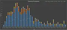 A graphical representation of Ilaiyaraaja's discography over the years with colours to represent languages, done through web-scraping using Python