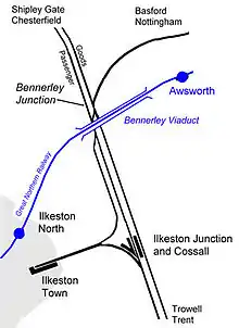 It carried a shuttle service to Ilkeston Town railway station which was never particularly popular since the GNR provided a direct main line service.[3] Some services were also provided to Nottingham and Chesterfield.[4] Since the latter passed through the north curve of the junction, they were unable to call at the station. The same was true of Nottingham trains when they ran on the short-lived branch between Bennerley Junction and Basford.