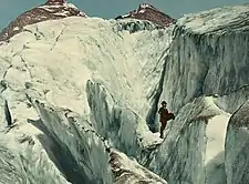 The influx of visitors to the glacier brought both mountaineers and glaciologists. The first recorded ascent of the glacier was by A. O. Wheeler with Edward Feuz and Charles Clarke in 1901, although it had most likely been climbed earlier.[9] Wheeler and the Alpine Club of Canada built the Arthur O. Wheeler hut near Glacier House for mountaineering use. Feuz was one of several Swiss guides hired by the CPR to accompany visitors to the glacier and up nearby peaks.[5]