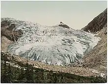 Although First Nations people were present in valleys to the east and west, evidence of aboriginal settlement in the Illecillewaet area has not been found.[5] The first European to visit the glacier was Major A.B. Rogers, a railway surveyor, who examined the area in 1882 and 1883 in search of a viable pass.[6] With the completion of the transcontinental Canadian Pacific Railway (CPR) through nearby Rogers Pass in 1885, the glacier and its surrounding area became one of western Canada's first tourist destinations. Glacier National Park was established in 1886, and Glacier House, a small hotel, was built near the terminus of the glacier in the same year.[5] The hotel was expanded in 1892 and 1904,[7] and by 1907 the glacier was described as the "most visited glacier in the Americas".[6]