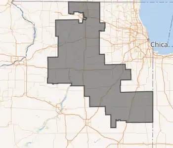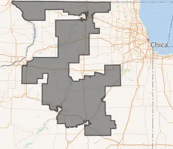 The congressional district covers parts of DeKalb, Ford, Stark, Will and Winnebago counties, and all of Boone, Bureau, Grundy, Iroquois, LaSalle, Lee, Livingston, Ogle and Putnam counties, as of the 2011 redistricting which followed the 2010 census. All or parts of Belvidere, Channahon, DeKalb, Dixon, Loves Park, Machesney Park, Ottawa, Morris, Pontiac, Rockford and Streator are included.[4] The representatives for these districts were elected in the 2012 primary and general elections, and the boundaries became effective on January 5, 2013.