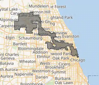 The 5th congressional district of Illinois covers parts of Cook and DuPage counties, as of the 2011 redistricting which followed the 2010 census. All or parts of Chicago, Elmhurst, Elmwood Park, Franklin Park, Hinsdale, La Grange Park, Norridge, Northlake, River Grove, Schiller Park, and Oakbrook Terrace are included.[4]