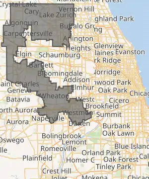 Illinois's 6th congressional district covers parts of Cook, DuPage, Lake, Kane and McHenry counties, as of the 2011 redistricting which followed the 2010 census. All or parts of Algonquin, Barrington, Barrington Hills, Bartlett, Burr Ridge, Carol Stream, Carpentersville, Cary, Clarendon Hills, Crystal Lake, Darien, Deer Park, Downers Grove, Elgin, East Dundee, Forest Lake, Fox River Grove, Gilberts, Glen Ellyn, Hawthorn Woods, Hinsdale, Hoffman Estates, Inverness, Kildeer, Lake Barrington, Lake in the Hills, Lake Zurich, Lakewood, Lisle, Lombard, Long Grove, Naperville, North Barrington, Oak Brook, Oakbrook Terrace, Oakwood Hills, Palatine, Port Barrington, Rolling Meadows, Sleepy Hollow, South Barrington, South Elgin, St. Charles, Tower Lakes, Trout Valley, Warrenville, Wayne, West Chicago, West Dundee, Westmont, Wheaton, Willowbrook and Winfield are included.