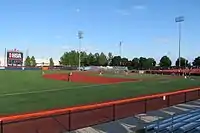 The stadium part of Illinois Field features bleacher seating for 1500 spectators. These seats wrap around the foul territory behind home plate from first-base to third-base. Additional space for another 1500 spectators is available on the grass areas located down the foul lines. Temporary seating can also be installed in this area for big games or events, like the Big Ten Tournament.