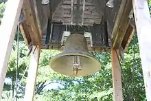 The Illinois Freedom Bell is located in Mount Morris, Illinois, and was cast as a replica of the Liberty Bell in 1862.[1][2] Following its casting, the bell was transported to Lake Geneva, Wisconsin, where it was kept in the belfry of a church along the north shore of Geneva Lake.[1][2] In 1910, the church was destroyed by a fire; the bell fell during the fire but was undamaged; following the fire, the bell was put into storage.[1][2] The church members then decided to reconstruct the church on the south side of the lake.[2] During the winter, as a group of men attempted to drag the bell across the frozen lake, the weight of the bell cracked the ice and it sank to the bottom.[1]