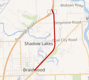 Illinois Route 129 (IL 129) is a 4.06-mile-long (6.53 km) north–south state road in northeastern Illinois. It runs from IL 113 in downtown Braidwood north to Interstate 55 (I-55).[1]