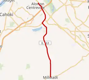 Illinois Route 163 (IL 163) is a 9.89-mile-long (15.92 km) north–south highway in southwestern Illinois.[1] It runs from IL 158 in Millstadt north to IL 15 in Alorton; the route is located entirely within St. Clair County. IL 163 is maintained by the Illinois Department of Transportation.