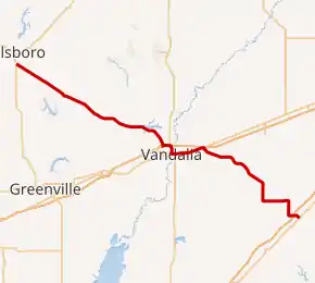 Illinois 185 runs geographically northwest-southeast through south-central Illinois. It overlaps both U.S. Route 40 and U.S. Route 51 through the city of Vandalia.