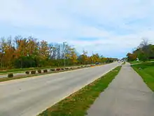 An additional three-mile section of Illinois 22 from Illinois 83 to Milwaukee Avenue, primarily located in Buffalo Grove, was another closely related project that was once again met with similar delays and concerns.[35] Long Grove got on board in May 2005 and approved any widening between its eastern city limits and Illinois 83.[36] Roadwork began in the fall on the two-year project, and in September 2007 it was finished;[37] complete with four concrete lanes and a center grassy median. Again, intersection improvements were also made, this time adding dual left turn lanes to both east–west approaches at Illinois 83 and Buffalo Grove Road.[3]