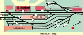 There are currently two platforms with 3 platform faces in Ilmenau station. Platform 1 (the "house" platform) is used for travel to Erfurt, while platforms 2 and 3 (sharing an island) are no longer used by scheduled services. Steam excursions to Rennsteig operate from platform 2, but platform 3 (a bay platform) is currently not used. Two other tracks were used for freight operations to the east of the three platform tracks. These were removed about 2002, but the loading ramp is still easily recognisable. Many tracks were also formerly operated in the north-eastern part of the station for marshalling and freight traffic. Three factory sidings branched off directly from the station: one ran to the slaughterhouse, another to the Porzellanfabrik Galluba & Hofmann (porcelain factory on Neuhäuser Weg) and the third ran for about two kilometres to the Graf von Henneberg Porzellan Ilmenau (another porcelain factory). It was laid down only in 1973 and included another freight yard with several tracks to the north of the station. The construction of a new freight yard started in the 1970s, which was located to the east of the station on Neuhäuser Weg. In 2006, there was a large open-air area with railway tracks and station lighting systems. It is planned to convert the area into a commercial area.