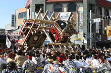 The Imari Ton-Ten-Ton Festival is a fighting festival held every year in the city of Imari, Saga Prefecture, Japan. Beginning at the Imari Shrine, the festival is well known as one of the three great fighting festivals of Japan. The festival has been held since 1829. Two shrines, Aramikoshi and Danjiri, meet at various points throughout central Imari. They are smashed together simultaneously until one shrine falls back. This is done to the sound of a beating drum within the shrine Danjiri, the sound of which gives Ton Ten Ton its name.[1]