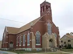 It is a red brick cruciform church building which is significant mostly for its unusual stained glass windows designed by the Bavarian Art Glass Company of Munich, given dispensation to be placed in the church by special permission of the pope.[2]
