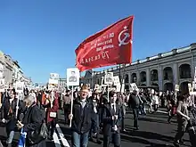At the end of summer and autumn of 2018, various left-wing forces organized the "Shameful Regiment" marches, on which photographs of prominent political figures who supported raising the retirement age.[28][29] It took place as part of the 2018 Russian pension protests.