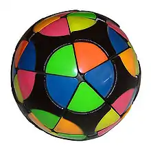 The Impossiball is a rounded icosahedral puzzle similar to the Rubik's Cube. It has a total of 20 movable pieces to rearrange, which is the same as the Rubik's Cube, but all of the Impossiball's pieces are corners, like the Pocket Cube.