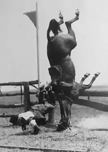 ![]() Petneházy crashing at the 1932 Olympics. Neither the rider nor the horse were injured; Petneházy remounted and finished the race. | |