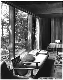 The compact, efficient kitchen utilizes white steel cabinets with grey sliding doors and clean white formica counter tops. All are original. An obscure glass pass-through serves both the living room and the screened porch.[2] The interior of the main house is remarkable in that a great deal of ingenuity was employed in the utilization of space, in the design of cabinets, the efficient arrangement of utilities and furniture, even in the location of permanent lighting fixtures. The integrity of the interior is extremely high, with only slight changes having taken place since its construction. For example, an interior ventilation system, based on narrow, below-window hinged wooden panels, has been permanently closed and is rarely used today, but a workable transom survives over the front door and the south plate glass windows. The former are the only non-operable features in the house.[2]
