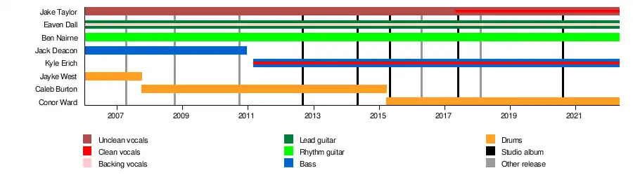 In Hearts Wake are an Australian metalcore band from Byron Bay, formed in 2006. The band comprises vocalist Jake Taylor, guitarists Eaven Dall and Ben Nairne, bassist Kyle Erich, and drummer Conor Ward. They have released five studio albums: Divination, Earthwalker, Skydancer, Ark and Kaliyuga, which was released on 7 August 2020.[1] The band's lyrical themes include environmentalism, environmental justice, global warming, conservation, and other social issues.