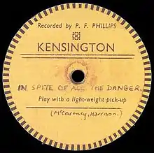 Around July 1958,[nb 1] the Quarrymen paid for a recording session at Percy Phillips' home in Kensington, Liverpool, recording a cover of Buddy Holly's "That'll Be the Day" and "In Spite of All the Danger".[16] Lennon, McCartney and Harrison all played guitar,[nb 3] John "Duff" Lowe the piano and Colin Hanton the drums.[1][9] Recording was achieved with a single microphone suspended from the ceiling,[9] no volume balancing possible.[1] Curtains and carpets were put in the downstairs living room to dampen the noise of traffic from the street outside.[1] At nearly three and a half minutes, the song is much longer than most contemporary recordings.[nb 4] Lewisohn writes, "anecdotes have Percy Phillips waving his arms at them, hurrying them to a finish, because he could see the disc-cutting lathe reaching its ultimate point, almost at the center label."[18]