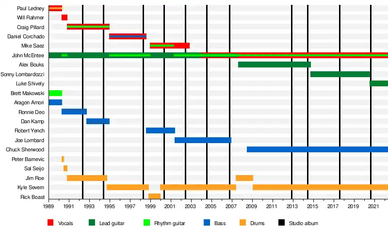 The band has seen many lineup changes in their 33-year history. Guitarist/vocalist McEntee is the sole original member, though drummer Kyle Severn has appeared on every studio album since their third full-length, Diabolical Conquest. Incantation first came to prominence with Onward to Golgotha and Mortal Throne of Nazarene, both of which feature Craig Pillard on vocals. Following the release of the Forsaken Mourning of Angelic Anguish EP in 1997, Pillard departed the band and was replaced by Daniel Corchado of The Chasm. Corchado performed on one album, 1998's Diabolical Conquest, before departing. Vocalist Mike Saez performed on the next two albums, The Infernal Storm (2000) and Blasphemy (2002). Beginning with Decimate Christendom, McEntee took on vocal responsibilities, a role that he continues to the present.