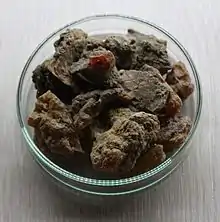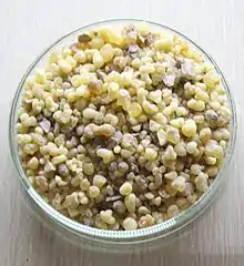 The biblical word used here is נטף = naṭaf (Exo. 30:34), which was later called in Mishnaic times by the name צרי = ṣorī. By the time of the post-Second Temple era its meaning had already become spurious, which led Rabban Shimon ben Gamliel to say: “The ṣorī is no more than gum resin [that drips] from resinous trees.”[53] For this reason, Rabbi Saadia Gaon translates naṭaf as mastic.[54][55] In Arabic-speaking countries, mastic (Arabic: المصطكي) is a generic word used for many chewable gum resins, especially a chewable gum extracted from a species of frankincense.[56] The same is true of its Aramaic/Hebrew cognate (מצטכי).[57] Some Latin texts place here myrrh, whereas other texts place balsam[58] (balsamon), now generally recognized as Balsamodendron opobalsamum, but classified by some botanists as Commiphora opobalsamum, and which has yet still the other taxonomic name of Commiphora gileadensis. Often translated in English texts as "stacte," it implies any gum resin that exudes in drops from certain trees.