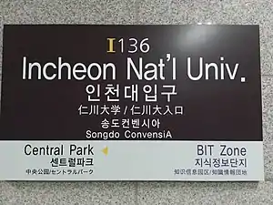 Incheon Nat'l Univ. Station is a subway station on Line 1 of the Incheon Subway in Yeonsu-gu, Incheon, South Korea. It has four exits connecting it to Incheon National University, nearby hotels, and the east side of Songdo Central Park.