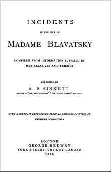 Incidents in the Life of Madame Blavatsky: compiled from information supplied by her relatives and friends is a book originally published in 1886 in London;[1][2] it was compiled by a member of the Theosophical Society A. P. Sinnett, the first biographer of H. P. Blavatsky (née Hahn).[3] He describes the many unusual incidents in her life, beginning from her childhood in Russia and asserts that she has been with "an early connection with the supernatural world;" he says about her short unlucky marriage and "decade of extensive global travels," about her period of learning in Tibet, and the "criticism she received about some of her 'phenomena' and practices."[4][note 1]