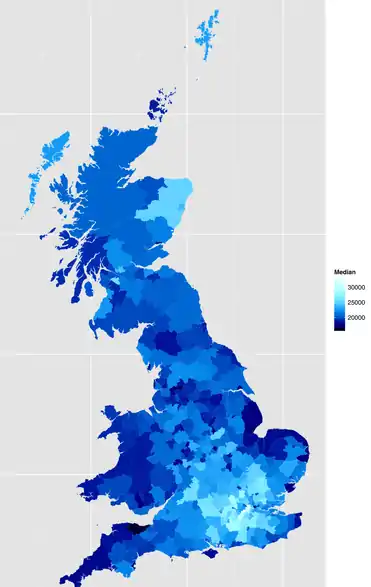 The most recent SPI report (2012/13) gave annual median income as £21,000 before tax and £18,700 after tax.[5] The 2013/14 HBAI report gave median household income (2 adults) as £23,556.[7] The provisional results from the April 2014 ASHE report gives median gross annual earnings of £22,044 for all employees and £27,195 for full-time employees.[6]