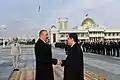 Berdimuhamedow and Ilham Aliyev in front of the Ceremony Field and Protocol Building.