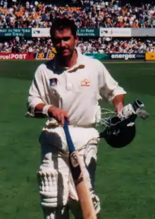 Waugh had walked in amidst loud ovation, and his arrival was widely anticipated. However, he immediately got into trouble, when, Martyn punched a ball through covers, and then ran two for it. Waugh then backed up for a third run, but Martyn pleaded to him emphatically enough to ignore the run. However, by the time Waugh did heed the call, it was too late for him to turn around. Martyn then sacrificed his wicket for his captain's. He was run out by Harbhajan Singh's throw from the deep, which Parthiv Patel took and whipped off the bails. However, the strangeness of the dismissal was accentuated by the fact that the ball was a no-ball. Waugh could not redeem himself as he got out shortly to a short ball by Zaheer Khan, and while trying to negotiate a ball from Zaheer, overbalanced and trod on his stumps. This dismissal gave him the dubious distinction of being the only man to be dismissed in every way possible in cricket, barring obstructing the field and timed out.[9] Referring to his failure and the unfortunate mix-up between him and Damien Martyn, Greg Chappell mentioned in an interview that Waugh's last mile was going to be uphill from then.[10] Waugh's dismissal brought the score down to 275/5.