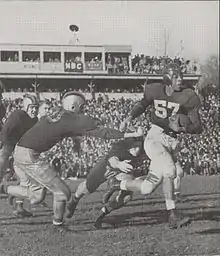 In the fall of 1960 the Indiana football program was hit with devastating NCAA sanctions.[19] The sanctions resulted from violations that included the offering of free plane tickets to several athletes along with financial stipends, according to an NCAA report, while other recruits were delivered envelopes filled with cash.[19][20]