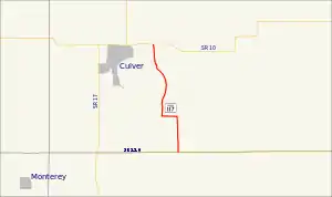 SR 117 starts at an intersection with SR 110, at the Fulton–Marshall county line, southeast of Culver. The highway head north, passing between a golf course and farmland, before curving and becoming an east–west roadway. The roadway head west towards Lake Maxinkuckee, before another curve turning the road back towards the north. North of the curve the road runs along the east side of the lake, passing by mostly houses. As the lake ends, SR 117 passes through Culver Military Academy, before ending at an intersection with SR 10, east of Culver.[2][3] The highest traffic count for SR 117 in 2015 was at its northern end, where 1,215 vehicles travel the highway on average each day. The lowest traffic count during 2015 was at the southern end of SR 117, where 474 vehicles travel the highway on average each day.[4]