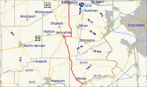 SR 129 begins at SR 56 on the banks of the Ohio River on the west side of Vevay. The route heads northwest as a two-lane rural highway, passing through farmland and woodland. The route has an intersection with SR 250, in rural Switzerland County. The highway crosses into Ripley County and begins a concurrency with SR 62. The concurrency heads north-northeast passing through Cross Plains. North of Cross Plains, SR 62 turns east and SR 129 keeps heading north-northwest. The road enters Versailles from the southeast and begins a concurrency with U.S. Route 421 (US 421). The two routes head north towards downtown Versailles and US 50. At US 50, the concurrency with US 421 ends when it heads east concurrent with US 50. SR 129 heads east concurrent with US 50 and leaves town, entering Versailles State Park. After passing through Versailles State Park, the concurrency endS when SR 129 turns north towards Batesville. The highway enters Batesville and ends at an intersection with SR 46.[2][3]