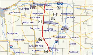 In 1915, prior to a state road system in the state of Indiana, the Hoosier Dixie Highway ran along some of what later became part of SR 15. The Hoosier Dixie Highway ran from the Ohio state line, in West Harrison, to the Michigan state line north of Goshen.[6] When the state of Indiana started the state road system the SR 15 designation went from Indianapolis to SR 25, east of Michigan City, passing through Logansport and La Porte. At this time the modern corridor of SR 15 was part of SR 27. In 1926 the Indiana Highway Commission renumber most roads with this renumber the SR 15 designation was moved east to its modern corridor. This highway ran from Marion to Goshen, routed along SR 13 between Wabash and North Manchester. Then the SR 15 designation turned west along modern SR 114 to a point south of Silver Lake where SR 15 turned north along its modern route. At this time the original route of SR 15 became part SR 29.[2][7] During 1928 the roadway between Milford and New Paris was rerouted to its modern route. This realignment straightened the road and eliminated two railroad crossings with the Big Four Railroad.[8][9][10] In 1930 the designation was extended north to the Michigan state line.[11][12] An authorized state road along modern SR 15 between Wabash and SR 114, just south of Sliver Lake, was added in late 1932.[13][14] This route became part of the state road system in 1934.[15][16] Within the next year the entire route of SR 15 became a high type of driving surface.[16][17] Between 1949 and 1950 SR 15 was rerouted between La Fontaine and Wabash, passing through Treaty.[18][19] The road was extended south from Marion to Jonesboro, along the former route of SR 21, in either 1950 or 1951.[19][20]