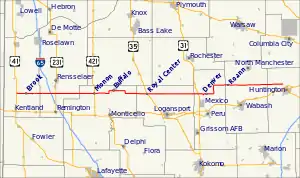 SR 16 begins at US 41 at an intersection in rural Newton County, just east of Ade. The state road heads east as a two-lane rural highway passing farms and fields, before passing through the town of Brook. East of Brook SR 16 passes over the Iroquois River and through an intersection with SR 55, before crossing into Jasper County. In Jasper County SR 16 crosses over Interstate 65, before an intersection with US 231. Past US 231 the road passes through rural Jasper county before entering White County.[1][3][4]