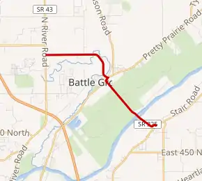 State Road 225 is a 4-mile (6.4 km) highway that connects State Road 43 at its west end with the State Road 25 at its east end. The highway passes through the town of Battle Ground, Indiana. The highway passes a service entrance to Prophetstown State Park.