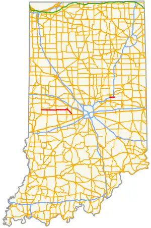 State Road 236 in the U.S. State of Indiana exists in two sections. The western section starts at U.S. Route 41 (US 41) in Parke County, and runs eastward, paralleling its parent that lies to the south, U.S. Route 36 (US 36). In western Hendricks County it then turns to the southeast and ends at State Road 39 (SR 39), only two miles north of that road's intersection with US 36 in Danville.