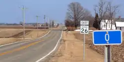 State Road 26 (IN 26 or SR 26) is an east–west discontinuous state road in the central part of the US state of Indiana. The western end of the western segment is at the Illinois border, where it continues as Illinois Route 9. The highway passes through rural areas of Warren and Tippecanoe counties, before ending near West Lafayette. The eastern segment begins at an interchange with Interstate 65 (I-65) and heads east passing through the cities of Kokomo, Hartford City, and Portland, before ending at the Ohio border, where it continues east as Ohio State Route 119. The road covers a distance of about 150.1 miles (241.6 km), passing through mostly rural areas.